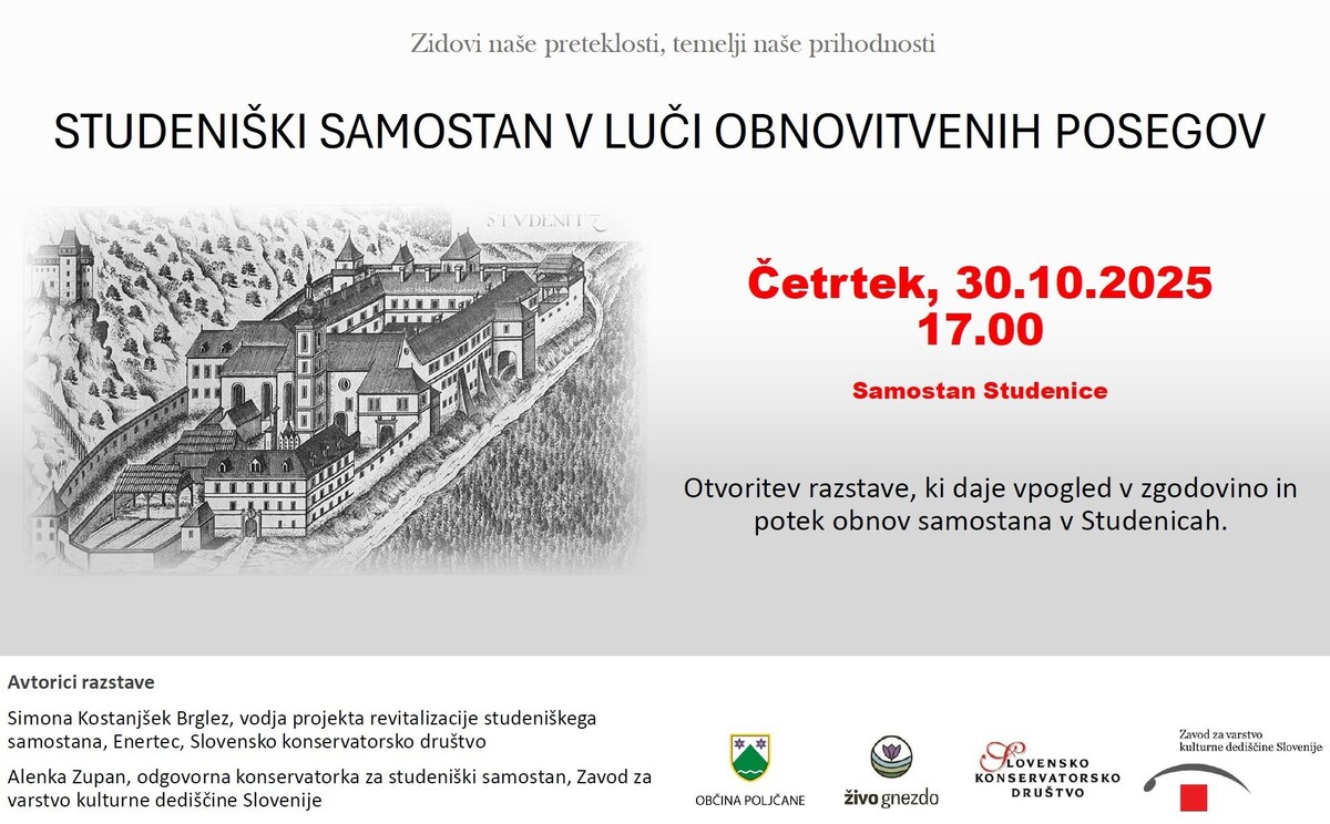 Studeniški samostan – eden najpomembnejših sakralnih in kulturnih spomenikov na Štajerskem – skozi razstavo “Studeniški samostan v luči obnovitvenih posegov” razkriva stoletno zgodbo o vztrajnosti, znanju in spoštovanju dediščine.