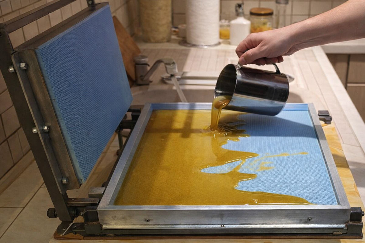 Najprej se očiščen čebelji vosek stopi pri primerni temperaturi, da postane tekoč.